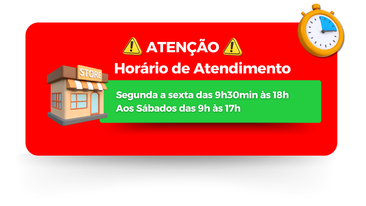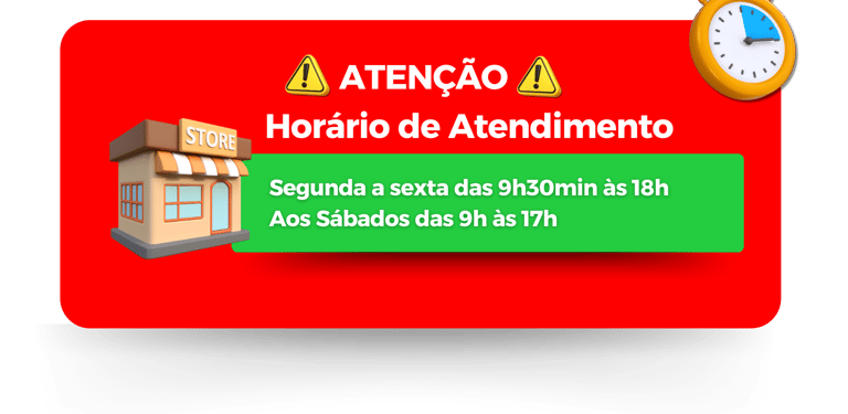 Horário de Atendimento:Segunda a sexta das 9h30min às 18Aos Sábados das 9h às 17h
