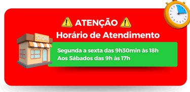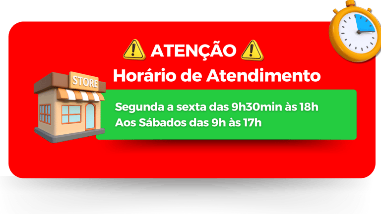 Horário de Atendimento:Segunda a sexta das 9h30min às 18Aos Sábados das 9h às 17h